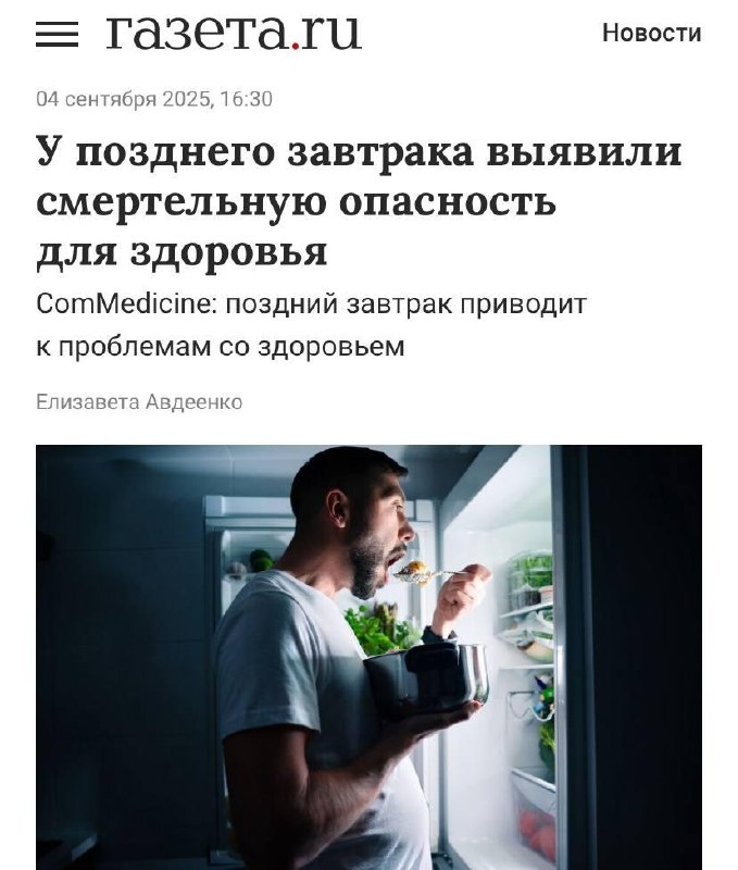 Привет, друзья! привет, друзья! Сегодня мы поговорим о том, как время нашего первого приёма пищи влияет на здоровье и качество жизни. Недавно врачи предупредили: поздний завтрак может значительно увеличить риск преждевременной смерти. Звучит как повод задуматься, не так ли? Представьте себе: вы просыпаетесь, а времени на полноценный завтрак нет. Спешка и нерегулярное питание становятся нормой. Но что происходит с нашим организмом в таких условиях? Смещение первого приёма пищи также связано с депрессией, хронической усталостью и нарушениями сна. Это как снежный ком: одно тянет за собой другое. Важно понимать, что забота о здоровье — это не просто следование моде или советам из интернета. Это наш выбор, который влияет на качество и продолжительность жизни. Давайте начнём день правильно, с полноценного завтрака. Он не только зарядит энергией, но и станет шагом к более здоровой и счастливой жизни. А что вы думаете о важности завтрака? Поделитесь своими мыслями в комментариях. Подписывайтес