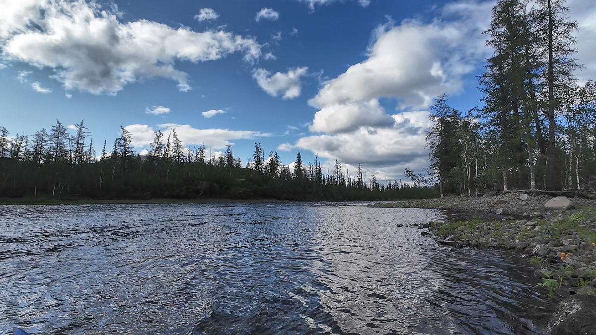 22 июля я отправился по озеру Собачье в сторону реки Муксун. До нее было около 10 км. Но сменившийся ветер снова погнал меня к берегу. Насколько переменчивая там погода, в считанные минуты направление ветра могло измениться на противоположное, а выгребать против волны то еще удовольствие. Возле берега хотя бы была возможность причалить и передохнуть. Примерно через 3 часа я оказался рядом с рекой Муксун. Справа была какая-то то ли база, то ли избушка с катамаранами, видимо там была группа туристов. Встречный ветер упорно не давал зайти в реку, не помогало и уже появившееся попутное течение. В конце концов напрягшись, я дошел до места, где течение реки уже стало оказывать существенную помощь. Вскоре с правой стороны показалась впадающая речка в реку Муксун, это была река Бильде. Прямо за ней я причалил к берегу и решил попытать удачу в рыбалке. Удача не заставила себя долго ждать, вскоре четыре больших хариуса были на берегу.
