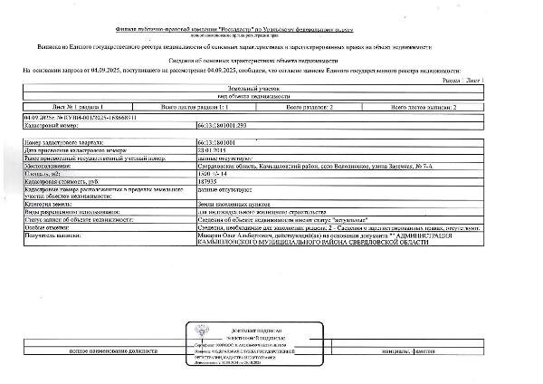 Название: Свердловская область, Камышловский район, село Володинское, улица Заречная, 7а, из категории земель – земли населенных пунктов, общей площадью 1500 кв.м., с кадастровым номером 66:13:1801001:293, разрешенный вид использования: для индивидуального жилищного строительства. Канал: Госземля Свердловская область Область: обл Свердловская Район: м.р-н Камышловский Населенный пункт: с.п. Обуховское, с Володинское, ул Заречная, з/у 7-А Локация: Смотреть на карте ВРИ: Для индивидуального жилищного строительства Кадастровый номер: 66:13:1801001:293 Кадастровая стоимость: 187935.00 Вид сделки: Продажа Площадь: 1500 м² Начальная цена: - руб. Дата завершения: 06.10.2025 Подробнее: ГИС ТОРГИ #госземля #земляотгосударства #земля #земельныйучасток #земельныеторги #торги #аукцион #продажаземли #продажа #свердловскаяобласть