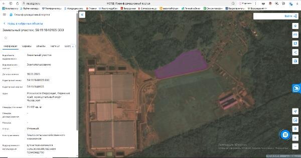 Название: Право на заключение договора аренды земельного участка, расположенного по адресу: Российская Федерация, Пермский край, Чусовской муниципальный округ, кадастровый номер: 59:11:1640105:330, площадью 71417,0 кв.м., вид разрешенного использования - для использования в сельскохозяйственном производстве, категория земель - земли сельскохозяйственного назначения, Канал: Госземля Пермский край Область: - Район: - Населенный пункт: - Локация: Смотреть на карте ВРИ: Сельскохозяйственное использование Кадастровый номер: 59:11:1640105:330 Кадастровая стоимость: 96412.95 Вид сделки: Аренда Площадь: 71417 м² Начальная цена: 9641.00 руб. Дата завершения: 06.10.2025 Подробнее: ГИС ТОРГИ #госземля #земляотгосударства #земля #земельныйучасток #земельныеторги #торги #аукцион #арендаземли #аренда #пермскийкрай