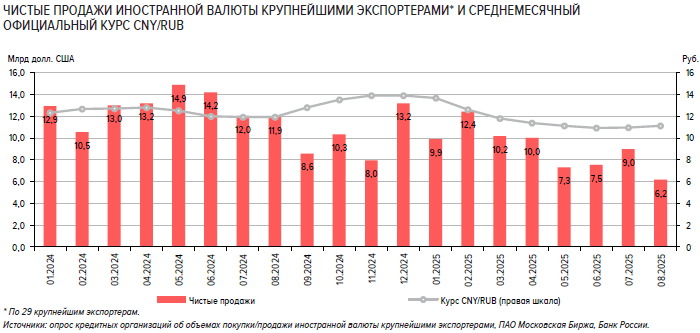 «Сокращение происходило на фоне роста доли рублевой выручки и накопления иностранной валюты с целью погашения обязательств перед банками», — сообщил регулятор. Источник: Банк России В августе крупнейшие российские экспортеры продали валюты на чистые $6,2 млрд, сообщил в пятницу Банк России в «Обзоре рисков финансовых рынков». Это на 31% меньше показателя июля (и на 22% меньше среднего показателя предыдущих трех месяцев), а среднедневные продажи сократились на 25% м/м. «Сокращение происходило на фоне роста доли рублевой выручки и накопления иностранной валюты с целью погашения обязательств перед банками. При этом общий объем предложения валюты со стороны юридических лиц (без учета банков) в августе вырос на 21,6%», — отмечает регулятор. Спрос физлиц на иностранную валюту на биржевом и внебиржевом рынках снизился в августе на 25% м/м, а юрлиц — вырос на 29,5% м/м. В целом, за первые восемь месяцев 2025 г. физлица купили иностранной валюты на 39% меньше, чем годом ранее: 673 млрд руб. про