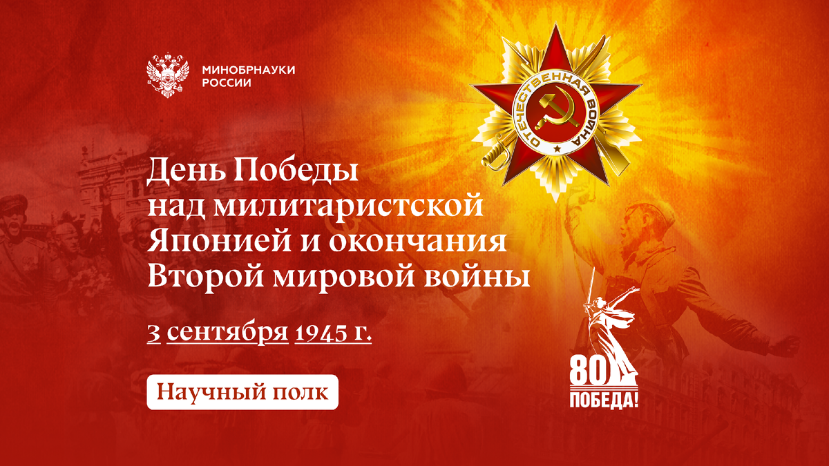 3 сентября в стране отметили День Победы над милитаристской Японией Какие материалы подготовили университеты и научные организации по случаю годовщины этого великого события — читайте в дайджесте «Научного полка». В последний день лета в возрасте 104 лет ушла из жизни Мария Колтакова — ветеран Великой Отечественной войны, легендарная «железная бабушка» БГТУ им. В.Г. Шухова. О свои сотрудниках и преподавателях-участниках войны с Японией рассказал СГУГиТ. В БрГУ вышел материал, посвященный преподавателю-фронтовику Михаилу Светлову — он встретил окончание Второй мировой войны, служа на Дальнем Востоке. ЮЗГУ вспоминает своего фронтовика Альберта Мищенко, самым выдающимся воспитанником которого стал летчик-космонавт СССР Игорь Волк. Из сотрудников ИФХЭ РАН на Дальнем Востоке воевали пятеро: старший лаборант Гарсков Александр, термист Грязнов Валентин, электротехник Шустов Василий, токарь Мурашов Сергей и слесарь Сидяков Николай. Опубликованы воспоминания кандидата исторических наук Арсения