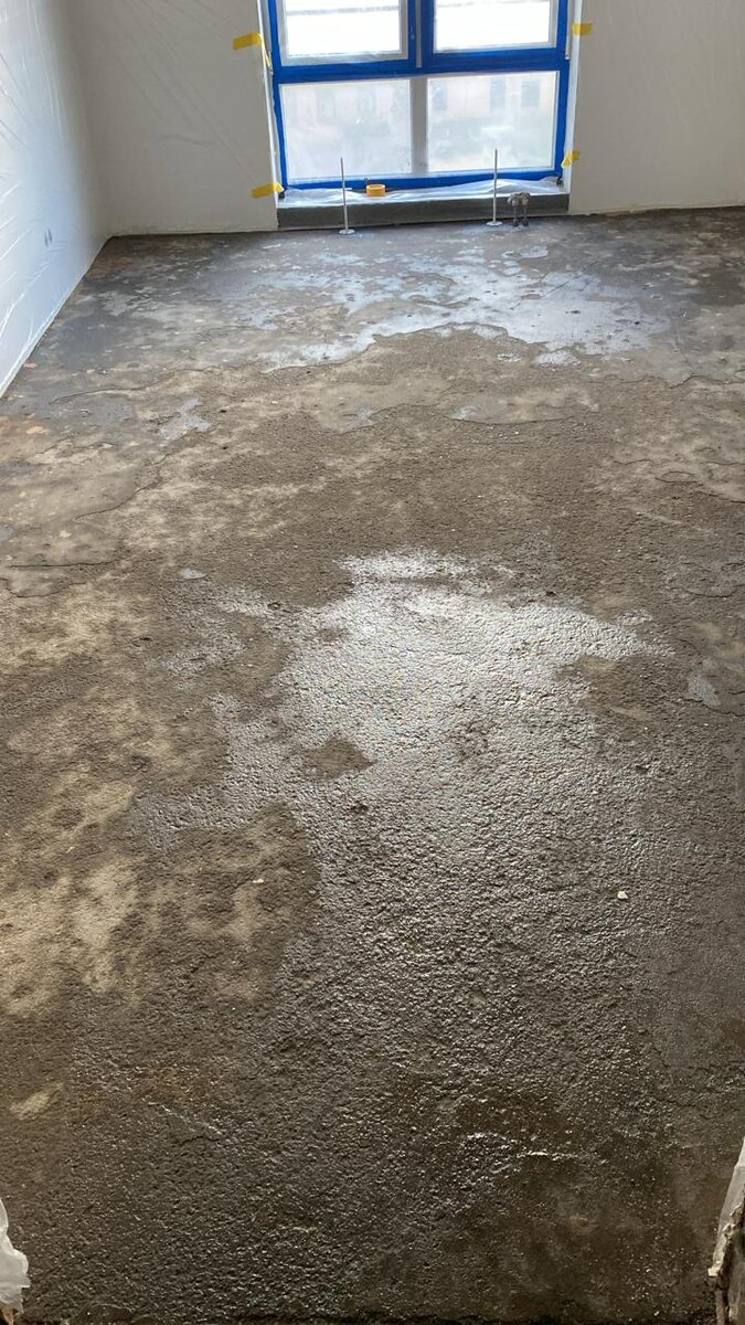 Иногда случается так, что строители экономят на материалах и времени. В таком случае, решать всплывающие проблемы приходится уже конечному потребителю. Если Вам сделали плохую стяжку или после снятия старого паркета, ламината, линолеума Вы обнаружили, что пол можно, со временем, вымести веником полностью, то есть вполне себе решение. Не то чтобы технически верное, но с учетом невысокой нагрузки, в плане эксплуатации, как например в квартире, можно обойтись упрочнением верхнего слоя. В данном случае, использовался полиуретановый грунт ПУ 555 ГРУНТ. Его следует нанести в 2-3 слоя, с соответствующей межслойной сушкой, чтобы пропитать пол на максимальную глубину. Полиуретановый грунт, в отличии от акриловых, типа глубокого проникновения, гораздо более мощный состав. Проникая в поры бетона, он заполняет их, а полимеризуясь, образует прочную структуру, делая верхний слой, практически, защитным покрытием. Далее, на такой пол уже можно класть модульно-рулонные покрытия типа паркета, ламината,