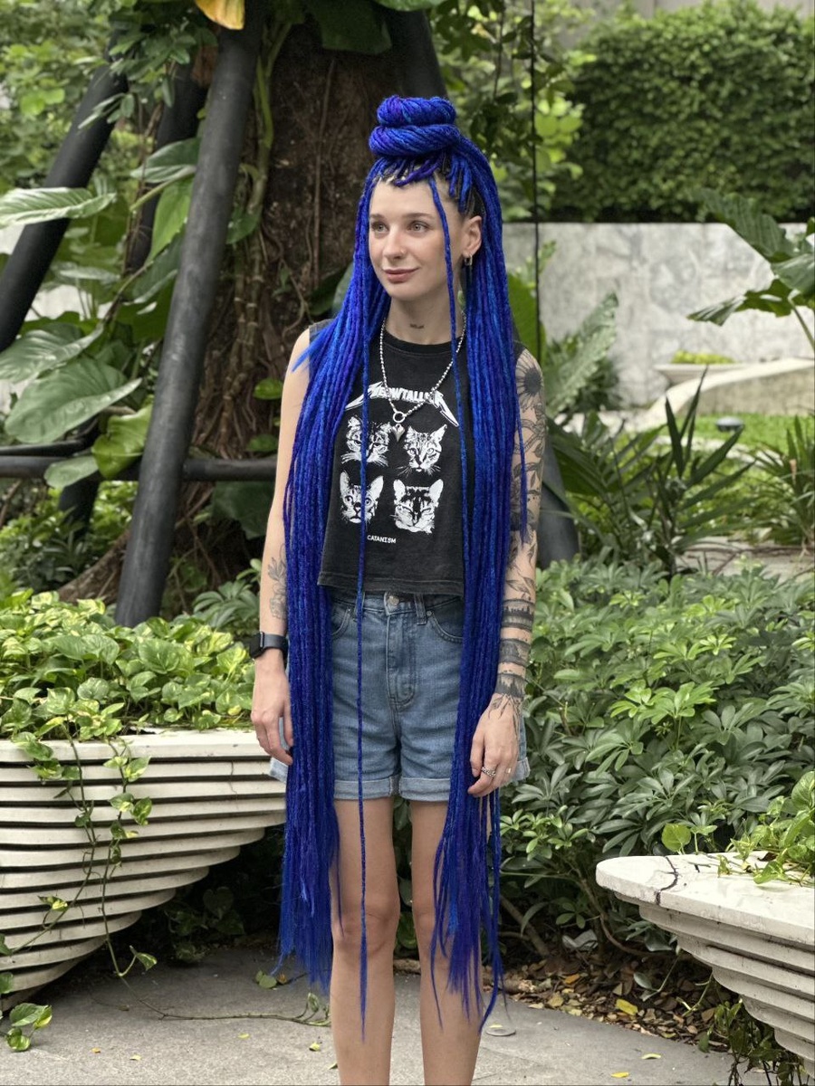 Эта сумасбродная бестия с длинными синими косами из мультсериала "Аркейн" украла ни одно сердечко. А как иначе? Уж слишком запоминающийся образ получился у аниматоров. Поэтому когда нам поступил заказ на этот комплект в цвете "электрик", мы с удовольствием взялись за реализацию идеи, но со своим видением. По весу дреды, конечно, отличались от стандартного комплекта, но их удалось облегчить за счет микса д.е. и с.е. заготовок. После изготовления комплект был отправлен в Таиланд, где его с нетерпением уже ждала заказчица и, как вы видите, это была любовь с первого взгляда и вплета. А вы бы вплели себе такой комплект? Очень интересно узнать ваше мнение.