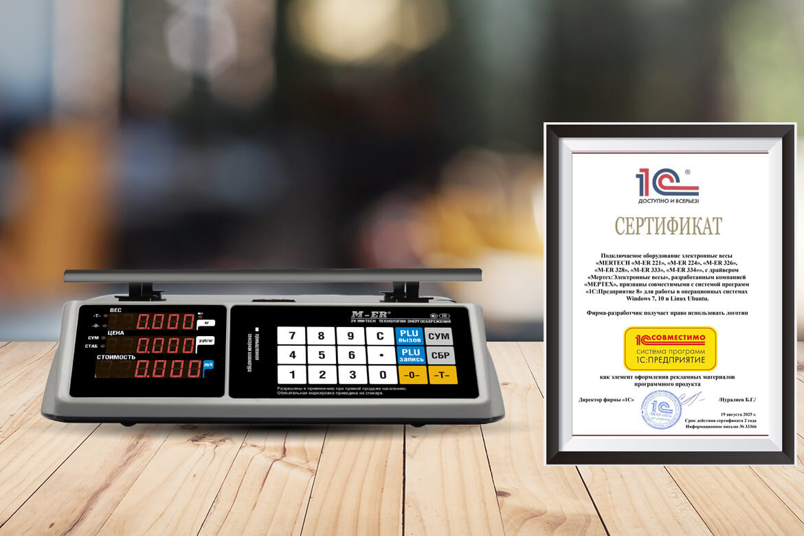 Электронные весы от компании MERTECH получили сертификат совместимости с программными решениями Сертификацию прошли модели M-ER 221, 224, 326, 328, 333, 334. Для подключения внешних устройств к 1С мы разработали специальный драйвер, который полностью отвечает стандартам компании. Мы расскажем, как проведена сертификация, и какие преимущества есть у моделей, совместимых с «1С:Предприятие».