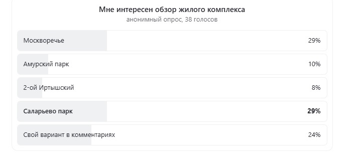 Друзья, добрый день, спасибо за участие в голосовании, получились следующие результаты: Итак, Москворечье - проект застройщика ПИК на юге Москвы. Всё прекрасно. Очень высокий уровень распроданности. Это район Москворечье-Сабурово, мы с Вами его рассматривали в составе локации Царицыно/Москворечье Сабурово Чуть севернее с 2018 активно строится вполне успешный проект застройщика "Пионер" "Life-Варшавская". полное завершение которого запланировано на 2026 год. К моменту ввода ЖК "Москворечье" должен появиться удобный пешеходный проход до станции "Варшавская" БКЛ - 24 минуты до центра Либо будет проще дойти сразу до станции Каширская зеленой ветки и до первой и до второй станции примерно 15 минут пешком. Хорошая локация, рядом музей-заповедник "Коломенское" и набережная Москва-реки Конкуренты представлены комплексами: Life-Варшавская от Pioneer Русич-Кантемировская от компании Русич Кавказский бульвар 51 от ПИК и Wave от ЛСР. Главный прямой конкурент - Life-Варшавская, позиционирующийся