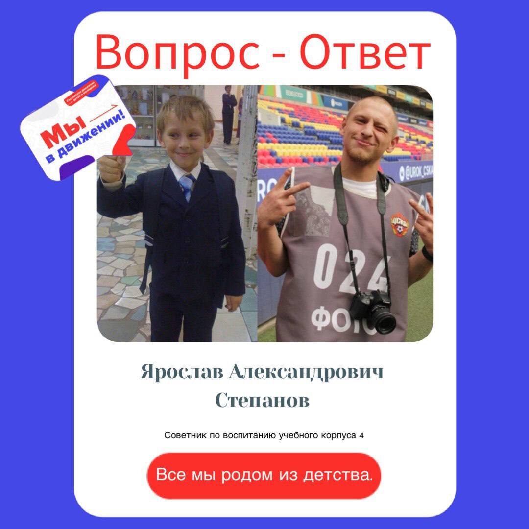 Наши советники! 🔥🔥 В каждой школе страны есть советник директора по воспитанию и взаимодействию с детьми (Движение Первых). Их задача — помогать развивать ученические идеи и инициативы, создавать новые мероприятия и проекты, а также вовлекать учащихся в федеральные и региональные активности. 😜 Давайте узнаем поближе нашего советника по воспитанию учебного корпуса 4, Ярослава Александровича Степанова, через блиц-опрос. ❓Вопросы советнику: 1. Какой ваш любимый школьный предмет? 🧮Математика, химия, история. 2. Какая книга или фильм оказали на вас влияние? 📚Александр Дюма — «Граф Монте-Кристо». Прочитав его в 15 лет, я много раз возвращался к фрагментам и переслушивал аудиокниги. Каждый раз открывал для себя что-то новое в этой великолепной истории. «Граф Монте-Кристо» поразил меня глубиной сюжета, силой эмоций и мудростью героя. Эта книга раскрыла ценность справедливости, верности и надежды, оставив неизгладимый след в душе. 3. Какое хобби или занятие помогает вам отдыхать?