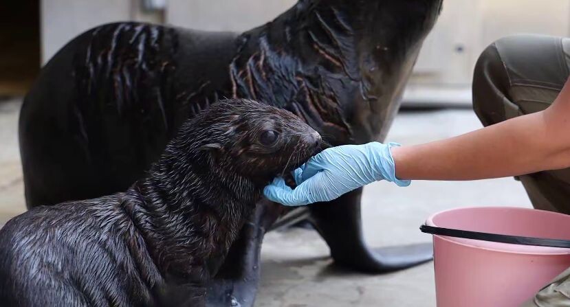 Сейчас морской котик уже выходит с мамой на показательные кормления, общается с другими обитателями павильона и сотрудниками.