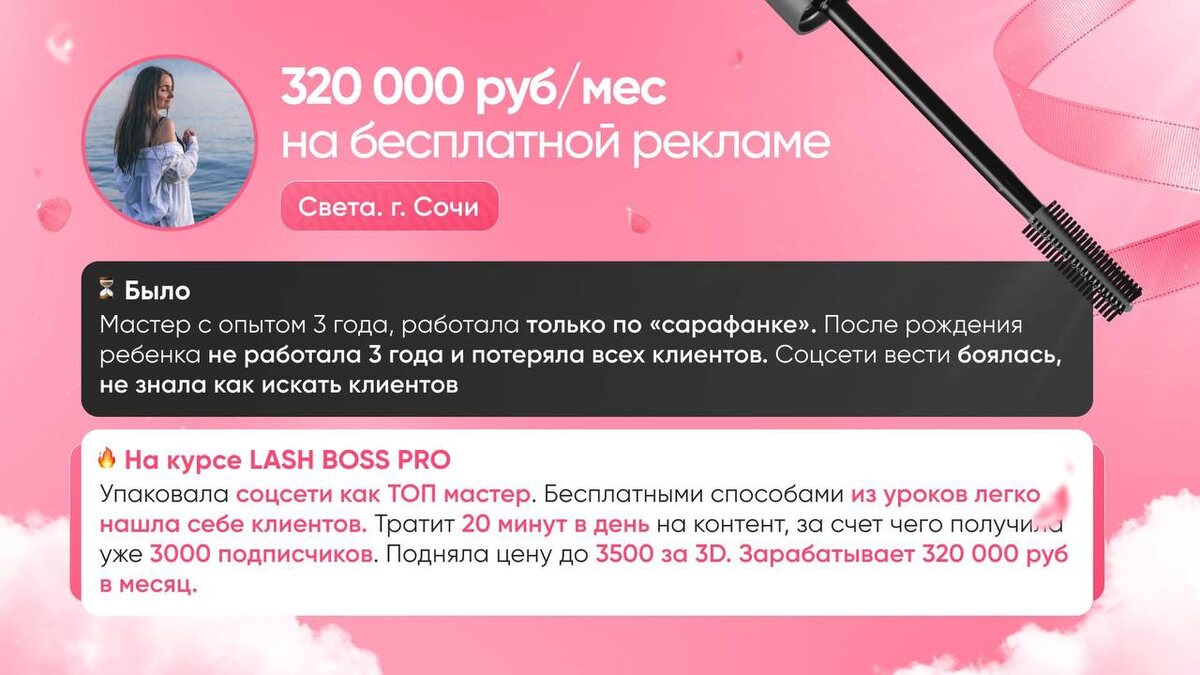 📍 Кейс Светы ✅ Превратилась из «мастера без клиентов» в ТОП-лэшмейкера 🔥 ✅ Применила бесплатные методы из системы Валеры и легко нашла постоянных клиенток ✅ Тратит всего 20 минут в день на контент, но уже набрала 3000 подписчиков ✅ Подняла цену с 2000 до 3500 рублей за 3D объем 💵 Доход: 320 000 рублей в месяц 🥹 📍 Кейс Нины ✅ Внедрила всего 6 бесплатных способов рекламы из арсенала Валеры ✅ Стала вести блог как эксперт для премиум-клиентов, уделяя этому лишь 20 минут в день 😎 ✅ Во время обучения постепенно подняла цену с 1500 до 4500 рублей 🤩 ✅ Теперь работает только с VIP-клиентками 💵 Зарабатывает 360 000 рублей в месяц и позволяет себе отдыхать за границей 3 раза в год 😍 Они не блогеры, просто девочки, как и вы И это не магия, это система продвижения, которой мы учим у нас на курсе 🫰