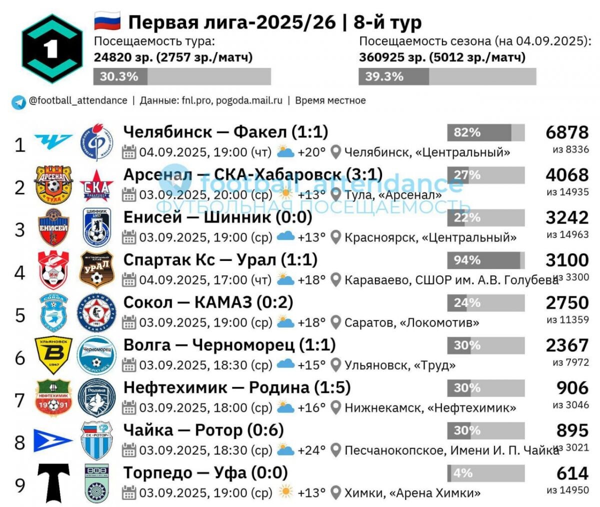 Именно на этой игре была зафиксирована наибольшая аудитория тура — 6878 зрителей. Однако на общем фоне этот лучший результат лишь подчеркивает общую тревожную тенденцию. Восьмой тур установил антирекорд сезона по посещаемости: девять матчей суммарно посетили 24 820 человек, а средний показатель тура составил всего 2757 зрителей. Это наименьшее значение в текущем сезоне, которое к тому же на 45% ниже общей средней посещаемости лиги в этом году (5012 зритель).