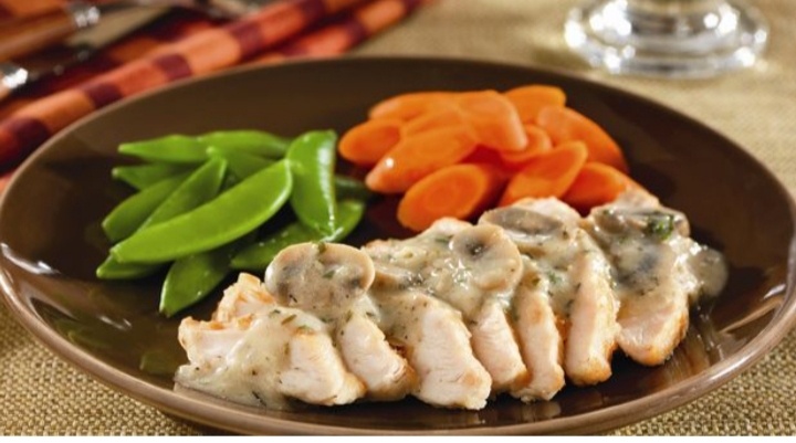 2. Разогрейте в сковороде смесь растительного и сливочного масла. Обжарьте курицу с двух сторон до золотистой корочки (около 3-4 минут с каждой стороны). Переложьте на тарелку.