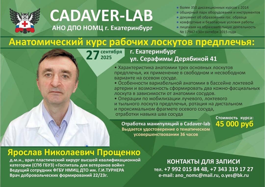 Уважаемые коллеги и гости моей страницы🤝 приглашаю Вас на авторский курс. 📍Анатомический курс рабочих лоскутов предплечья: • Характеристика анатомии трех основных лоскутов предплечья, их применение в свободном и несвободном варианте на осевом сосуде. • Особенности вариабельной анатомии в бассейне локтевой артерии и возможность сформировать два кожно-фасциальных лоскута в зависимости от анатомии сосудов. • Операции по мобилизации лучевого, локтевого и тыльного лоскута предплечья, ротация на дистальном и проксимальном фрагмете осевого сосуда, отработки навыка шва сосуда. Курс пройдет 27 сентября 2025г. (г.Екатеринбург). 📌Выдается удостоверение о тематическом усовершенствовании 36 часов. Записаться можно позвонив по номеру телефона 📲+7 992 015 84 48 📲+7343 319 17 27 или написав мне в комментариях.