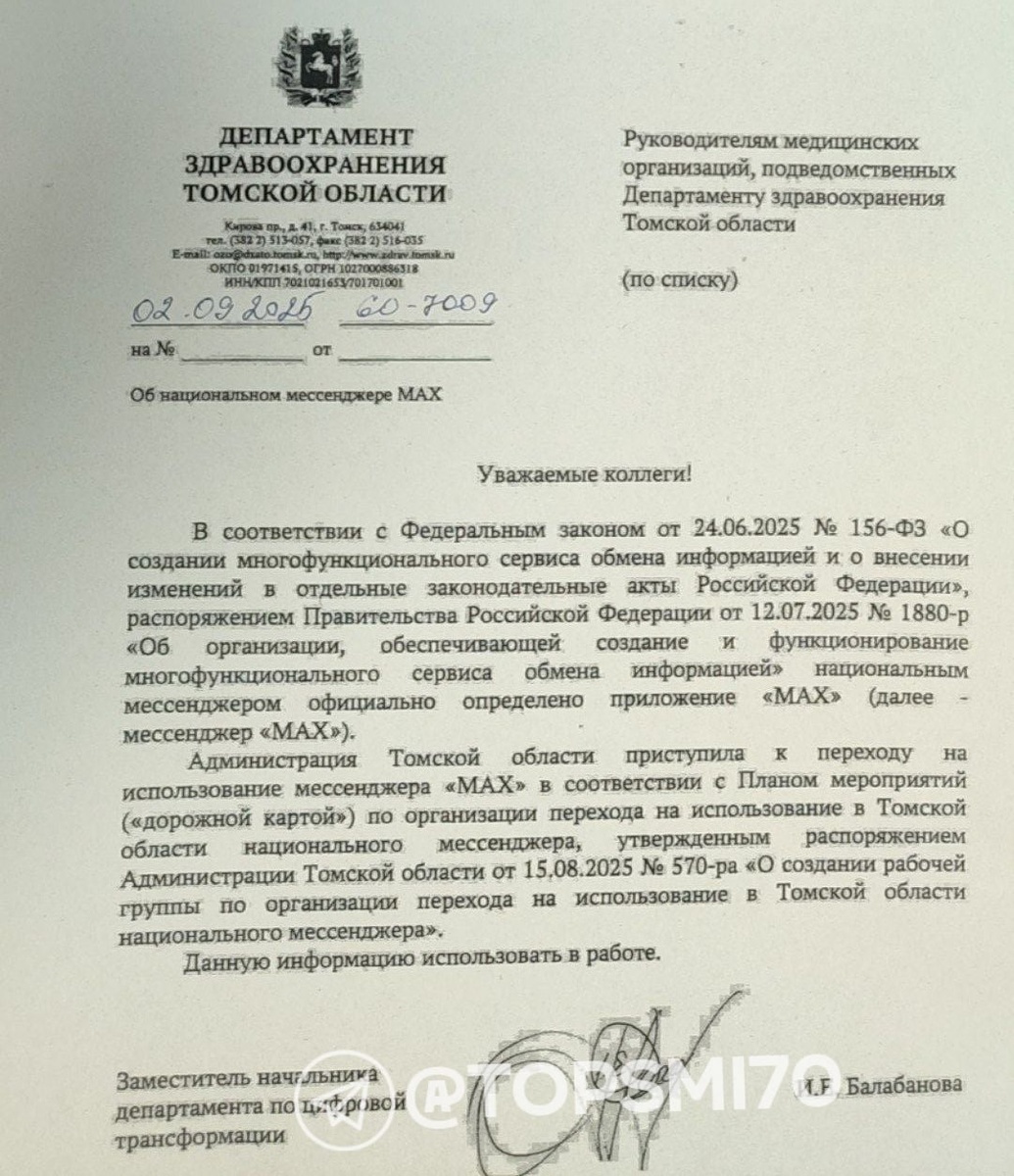 Томских студентов и медиков пытаются склонить к MAX Департамент здравоохранения Томской области направил письмо «Об национальном мессенджере MAX» (орфография сохранена) подконтрольным медицинским организациям. Копию документа опубликовал телеграм-канал «Новости Томска и области». «Администрация Томской области приступила к перехода на использование мессенджера MAX в. соответствии с планом мероприятий по организации перехода на использлвание в Томской области национального мессенджера, утверждённым распоряжением администрации области от 15 августа 2025 года. <…> Данную информацию использовать в работе», — говорится в сообщении, подписанном заместительницей начальника департамента Ирина Балабановой. При этом бумага, судя по формулировкам, не несёт никакого правового характера — это ни приказ, ни распоряжение, ни ещё какой-либо вид официального документа. Источник канала утверждает, что «в департамент здравоохранения поступило распоряжение о переходе на национальный мессенджер», а «ан