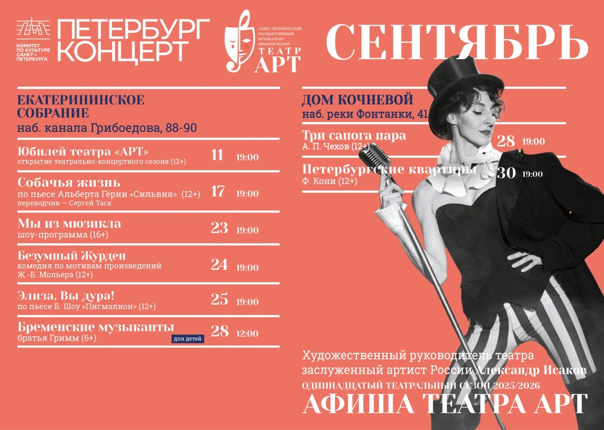 Представляем вашему вниманию сентябрьскую афишу театра «АРТ», которую откроет празднование 10-летия театра! Новый сезон «Петербург-концерта» 11 сентября откроется большим праздником в честь юбилея театра «АРТ» в Екатерининском собрании, где вас ждут любимые артисты, закулисные истории, театральные шутки, яркие номера, море танцев и музыки! Билеты на сайте пор ссылке. До встречи в новом сезоне!