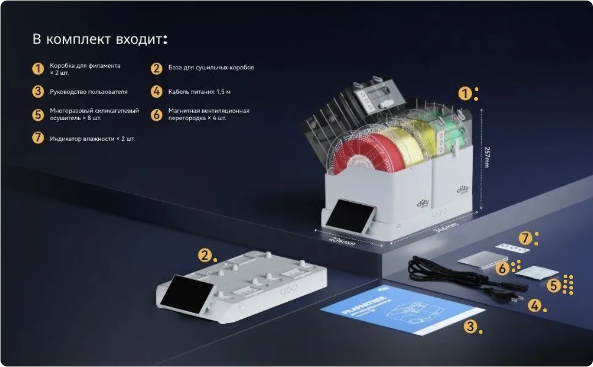 1 - двойные коробки для сушки нитей филамента (2 шт.), общие габариты устройства: w234/d346/h257mm;