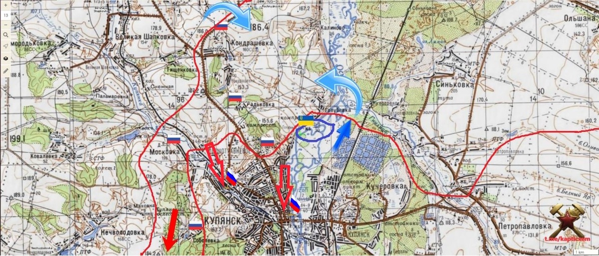 В ответ на пост Штурм Купянска Противник полностью потерял темп в атаках вдоль восточного берега Оскола у заброшенных отстойников, в то время как ВС РФ наоборот его нарастили, продвигаясь вдоль западного берега в черте города. Таким образом, вражеская попытка гонки на опережение полностью провалилась. схемы и карты