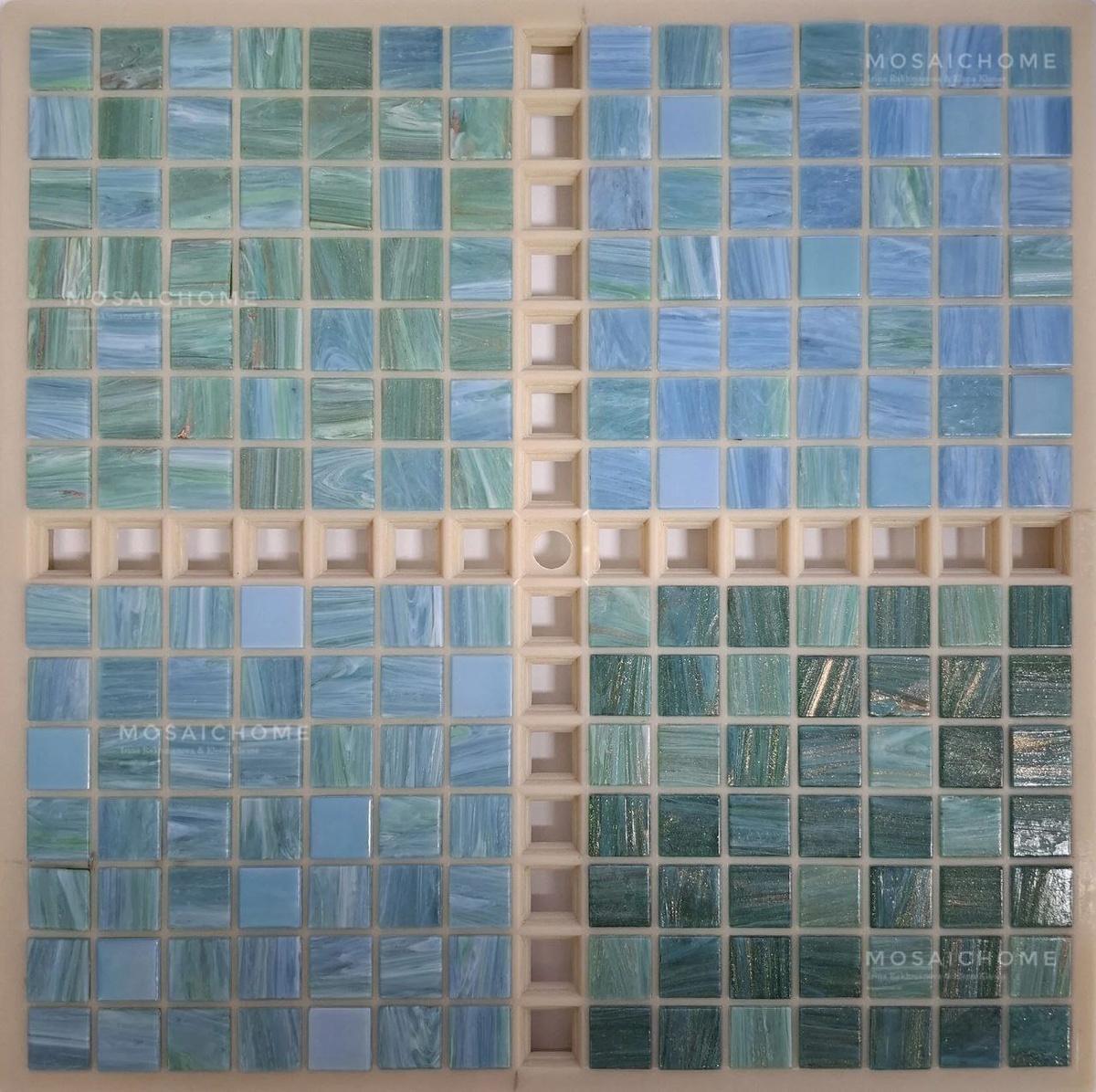 Из доступной коллекции мозаики мы набираем разные варианты на выбор заказчика: матовые и перламутровые оттенки, мозаика с авантюрином и мозаика с разводами.
