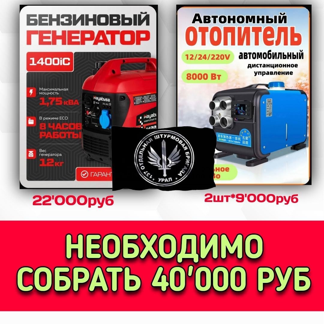 Друзья! Приступаем к первой задаче для штурмов: 🟢 АВТОНОМНЫЙ ОТОПИТЕЛЬ- 2 шт. 🟢 БЕНЗИНОВЫЙ ГЕНЕРАТОР - 1 шт. 📌Сумма к сбору - 40'000 руб. 🔺Собрано - 24'081 руб. 🔺Осталось собрать - 15'919 руб. Любую посильную сумму можно перевести на номер карты 💳2202208188194204 или по номеру телефона 📞+79530562233 Получатель - Светлана Владимировна Л. ("Сбербанк") #уралсвоихнебросает #вместемысила