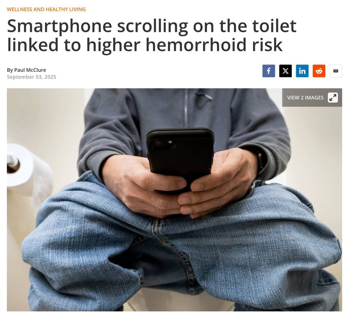 Любите посидеть в туалете со смартфоном? Эта привычка может дорого обойтись вашему здоровью. Ученые выяснили, что всего 5 минут с телефоном на унитазе повышают риск геморроя на 46%.