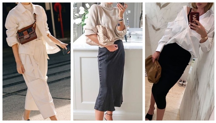 Чтобы комфортно провести рабочий день в офисе, необходимо подобрать одежду, которая не будет сковывать движения и вызывать дискомфорт. Деловой дресс-код требует определённого стиля — лаконичности и изящества. Однако это не значит, что образ должен быть скучным: внести изюминку в строгий наряд вполне возможно. Например, сочетание светло-голубых джинсов с белой блузкой, пуговицы которой украшены кристаллами, создаст свежий и привлекательный образ. Длинные рукава блузки можно дополнить манжетами длиной до трёх четвертей — это добавит образу завершённости. Также нежно и красиво смотрится с джинсами блузка кремового цвета с манжетами длиной около 20 см и вмещающими целый ряд пуговиц. К джинсам также подходит чёрный верх. Рубашка оверсайз, застёгнутая не на все пуговицы, смотрится свободно. Деловая одежда подразумевает наличие костюма с пиджаком. Брюки и пиджак одинакового цвета могут заиграть новыми красками, если добавить контрастные элементы. Например, к светло-сиреневому костюму с белыми