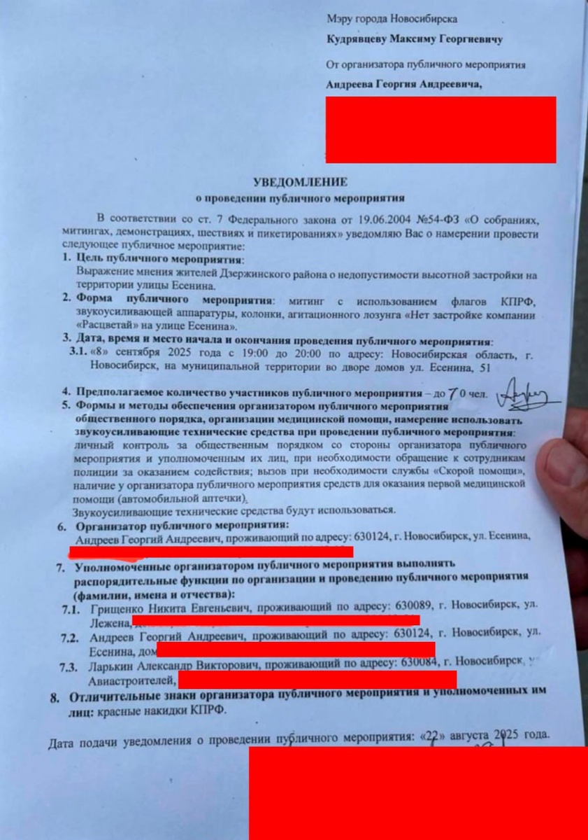 Новосибирский депутат подал в суд на мэрию из-за запрета уже согласованного митинга против точечной застройки Депутат горсовета Новосибирска Георгий Андреев (КПРФ) подал в мэрию заявку на митинг против точечной застройки в городе. Единственным лозунгом в уведомлении был слоган: «Нет застройке компании «Расцветай» на улице Есенина». Администрация согласовала акцию. Но в тот же день, когда Андреев сообщил об этом в соцсетях, мэрия отменила своё же решение под предлогом того, что депутат в своём анонсе мероприятия в телеграме якобы изменил повестку. Но в посте коммуниста было дословно процитировано то же самое, что и указано в его же согласованной заявке. Депутат предположил, что «мэрии указали, что негоже ругать Савельева». Компании строительной группы «Расцветай» принадлежат экс-депутату заксобрания Новосибирской области Владиславу Савельеву, который приходится братом депутату Госдумы от «Единой России» Дмитрию Савельеву. «Я расцениваю это как попытку точечного застройщика заткнуть