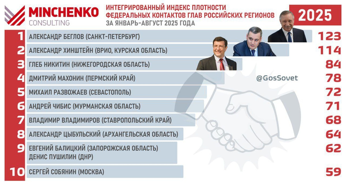 В ответ на пост Губернатор Мурманской области сохранил позиции в ТОП-10 глав российских субъектов по плотности федеральных контактов по итогам восьми месяцев 2025 года. Согласно данным индекса плотности федеральных контактов глав регионов России, составляемым коммуникационным холдингом «Минченко консалтинг», Андрей Чибис – на шестой строчке (с индексом в 71 балл), что неудивительно – вторую половину августа Андрей Чибис неоднократно встречался с федеральными чиновниками и представителями крупного бизнеса, имеющих экономический интерес в Мурманской области. ❄ «Арктический Обозреватель»