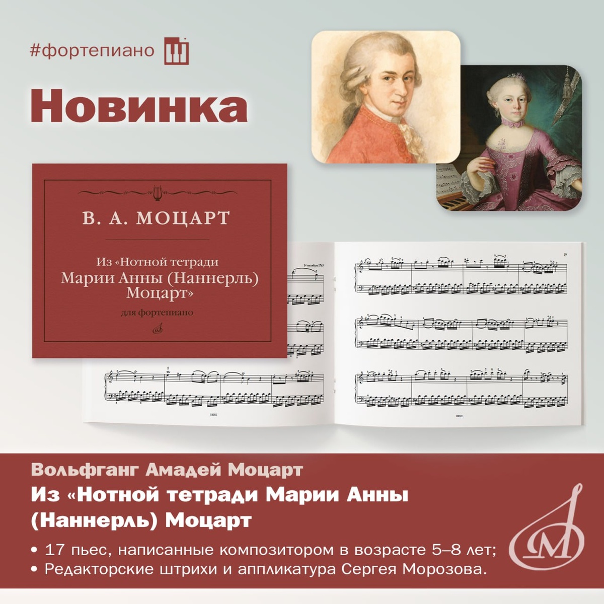 📎Новинка: В. А. Моцарт «Из Нотной тетради Марии Анны (Наннерль) Моцарт» В сборник фортепианных миниатюр вошло 17 сочинений юного композитора под редакцией С. А. Морозова. ⏺️«Nannerl Notenbuch» представляет собой подлинный исторический документ середины XVIII века. Со времён эпохи барокко мы часто сталкиваемся с семейными «хрестоматиями», создававшимися для занятий с детьми. Однако сборник «Из Нотной тетради Марии Анны (Наннерль) Моцарт» — особый случай. Тетрадь была начата в 1759 году Леопольдом Моцартом, отцом Вольфганга Амадея и его старшей сестры Марии Анны, прозванной Наннерль, для систематического музыкального обучения детей. Она включает в себя короткие пьесы, упражнения и этюды разных композиторов и поначалу предназначалась для Наннерль, которая была одарённой клавесинисткой. Со временем в Тетрадь стали записываться и первые сочинения юного Вольфганга. ⏺️Сборник стал важнейшим этапом в формировании музыкальных навыков обоих детей. Леопольд Моцарт также включил в тетрадь соб