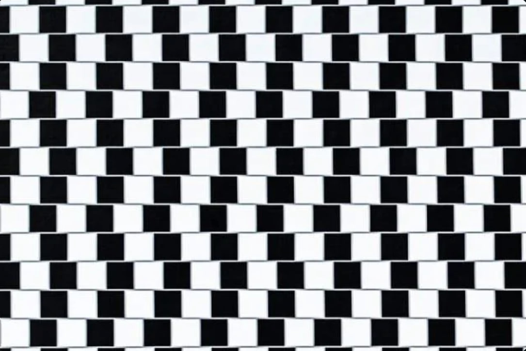 Эта классическая иллюзия называется "стена кафе" (cafe wall illusion) и была открыта в 1970-х годах. Наш мозг обманывается из-за нескольких факторов: 🔸 Контрастные границы — резкие переходы между черными и белыми квадратами создают "ложные сигналы" для зрительной системы 🔸 Смещенный паттерн — каждый ряд сдвинут относительно предыдущего, что усиливает эффект 🔸 Латеральное торможение — соседние нейроны в сетчатке "глушат" друг друга, искажая восприятие краев Почему эволюция нас "подвела"? На самом деле не подвела! Наш мозг оптимизирован для быстрого распознавания объектов в реальном мире. Эти "ошибки" — побочный эффект сложных алгоритмов обработки изображений, которые обычно работают безупречно. Интересно, что даже зная о иллюзии, мы не можем её "отключить" — она заложена на уровне базовой обработки зрительной информации! 🤯 Попробуйте сфокусироваться на одной линии — иллюзия станет слабее!