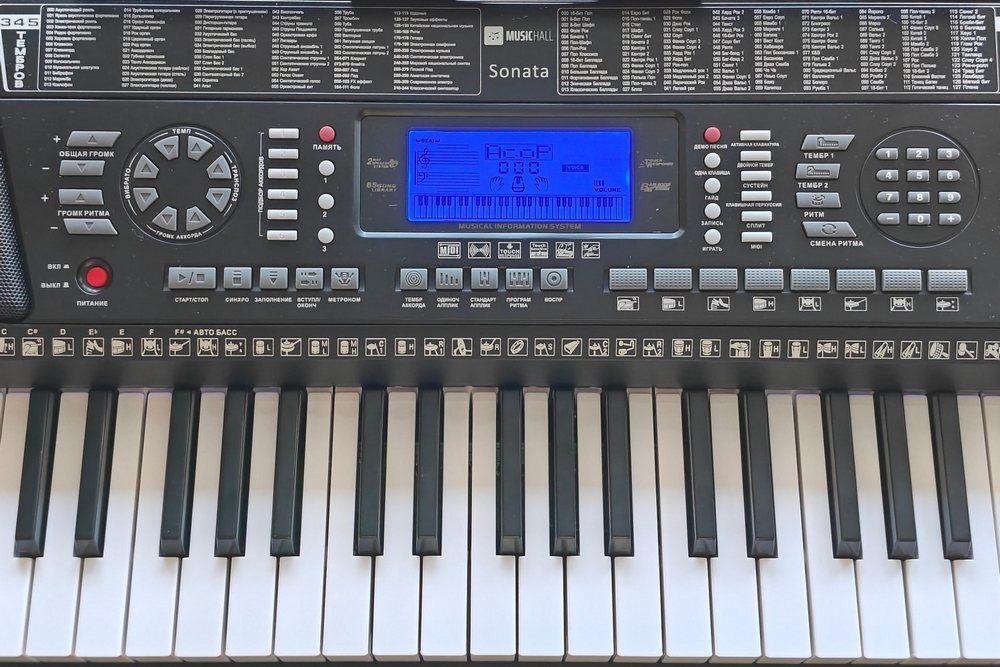 По звуку и арсеналу Sonata ориентирована на широкий круг задач. Здесь неплохая библиотека: 345 тембров, 128 ритмов и 65 демо-композиций. Вполне достаточно, чтобы комфортно осваивать жанры от попа до лаунжа и эстрады, искать собственное звучание и подбирать аранжировки для учебного репертуара. Полифония 32 голоса — честный компромисс: для занятий, домашней записи и выступлений в камерных пространствах этого хватает.