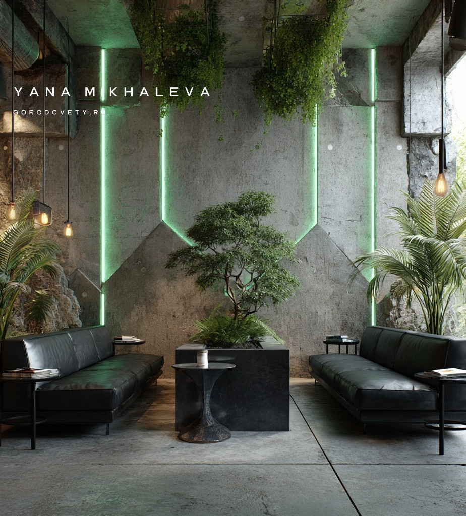 Если она выглядит скучно или неуютно, человек автоматически переносит это ощущение на весь сервис. Но есть простой инструмент, который превращает даже бетонное подвальное помещение в стильный лаунж — это правильно подобранное озеленение. Идеальное решение, если нужно разделить людей и создать уединение. Высокие прямоугольные кашпо чёрного или серого цвета + массивные растения (например, фикусы, пальмы или драцены). Получаются две отдельные «кабинки ожидания». Эффект: приватность, уют и лёгкая «тропическая» атмосфера без капитальных перегородок. Когда места на полу мало, «работаем сверху». Каскадные растения в подвесных кашпо или на металлической конструкции маскируют трубы и коммуникации, а при приглушённом неоновом свете создают ощущение зелёного оазиса. Эффект: добавляет глубину и динамику в интерьер, снимает ощущение «подвала». 3. Вертикальная фитостена Даже маленький участок стены можно превратить в акцент —