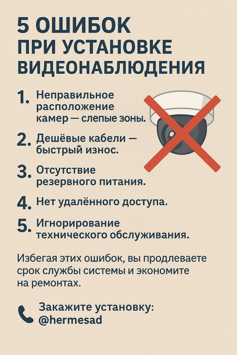 5 ошибок при установке видеонаблюдения 1. Неправильное расположение камер — слепые зоны. 2. Дешёвые кабели — быстрый износ. 3. Отсутствие резервного питания. 4. Нет удалённого доступа. 5. Игнорирование технического обслуживания. Избегая этих ошибок, вы продлеваете срок службы системы и экономите на ремонтах. — 📞 Закажите установку: @hermesad САЙТ: https://mojmaster.ru/ ДЗЕН: https://dzen.ru/mojmaster?share_to=link VK: https://vk.com/ProtectedVision TELEGRAM: https://dzen.ru/id/68ac74d51b50f2261d0d97f7 AVITO: avito.ru/brands/baby-time INSTAGRAM: https://www.instagram.com/mojmaster.ru?igsh=MXJkNHcyZW5xYnNlMw== #Смета #Видеонаблюдение #Проект #Прозрачность #ПожарнаяБезопасность #МонтажПодКлюч #БесплатныйВыезд #MojMaster