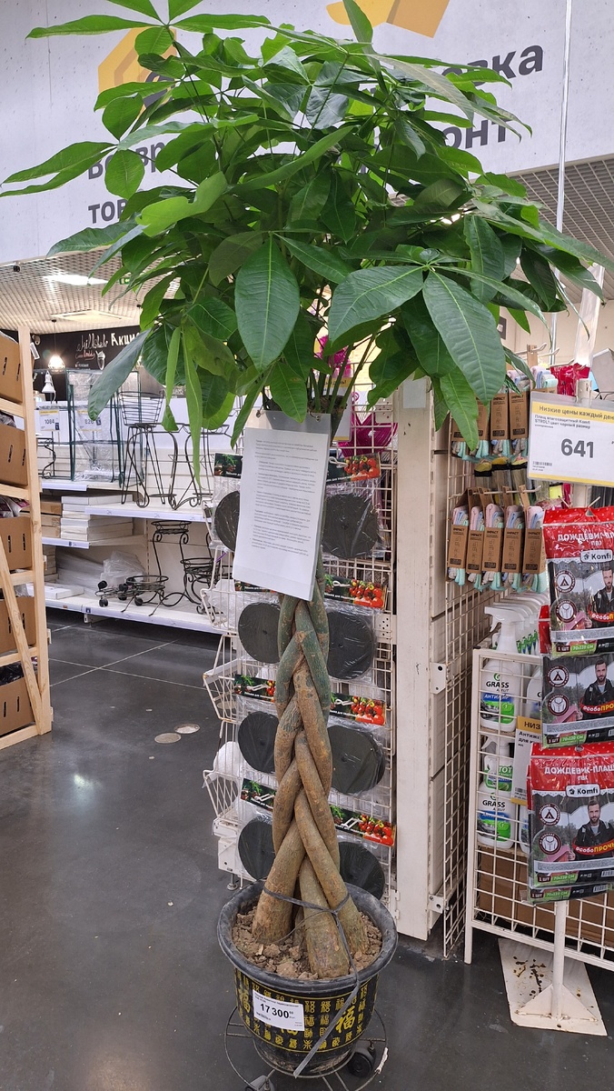 Интересное растение увидела в Лемана Про и вот что узнала о нём. Пахира водная (лат. Pachira aquatica) - растение семейства Мальвовые, вид рода Пахира. Произрастает во влажных районах Центральной и Южной Америки. В странах умеренного климата культивируется в качестве комнатного декоративного растения. Имеет много названий: за форму листьев - «малабарский каштан», за утолщённые внизу стебли - «бутылочное дерево», за форму плодов и вкус семян - «ореховое дерево». Пахира водная - вечнозелёное дерево высотой до 18 метров с характерными ходульными корнями. Листья кожистые пальчато-сложные тёмно-зелёного цвета с ланцетовидными листочками. Цветки белые или желтоватые, собраны в крупные (длиной до 35 см) метельчатые соцветия. Плод - одревесневающая вытянуто-округлая ягода оливкового цвета длиной до 10–25 см, содержащая внутри округлые семена. Но в домашних условиях растение практически никогда не зацветает. В Лемана продаётся в таком варианте и называется Пахира Акватика переплетённая. Стоимо