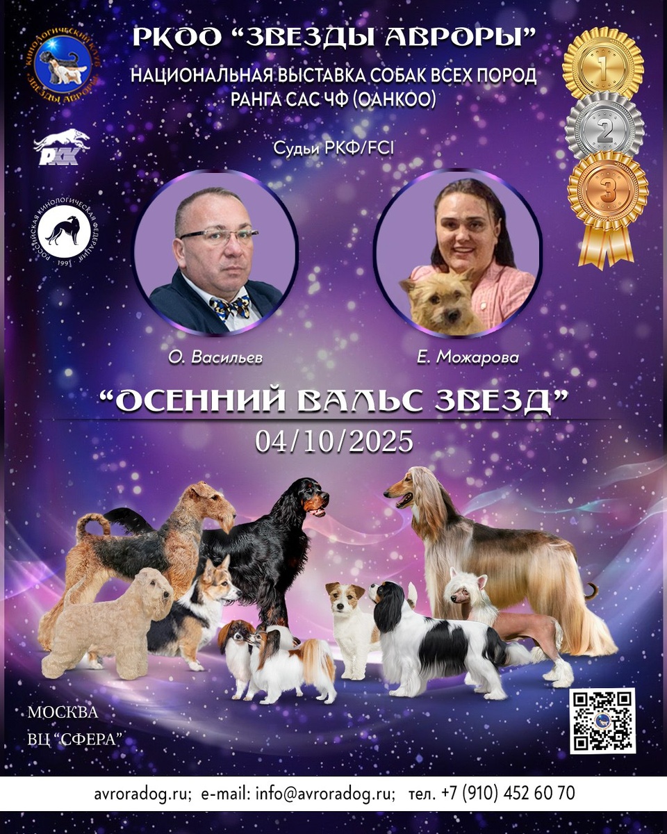 ⏰ 4 окт (29д) 🏛 #Москва #Россия #Выставка 🐶 Выставка собак: Национальная выставка собак всех пород ранга САС ЧФ (ОАНКОО) 🏆 Кинологическая общественная организация «Звезды Авроры» Контакты и вопросы организаторам здесь: 🌐 https://www.petsman.ru/vystavki-sobak.php?mesto=39-moskva Дорогие друзья и коллеги! Приглашаем вас на нашу выставку ранга САС ЧФ (ОАНКОО) "Осенний Вальс Звёзд", которая пройдет 04 октября 2025 года, в ВЦ "Сфера" г. Москва, ул. Кировоградская, 11, к1. Судья РКФ-FCI – Васильев Олег Судья РКФ-FCI - Можарова Екатерина (на подтверждении РКФ) Размеры целевых взносов на выставку САС ЧФ: по 31.08.25г - 3100р (сертификатные классы) /2100р (беби, щенки, ветераны); с 01.09 по 26.09.25г - 3300р (сертификатные классы) /2300р (беби, щенки, ветераны); с 27.09 до окончания записи - 3800р (сертификатные классы) /2800р (беби, щенки, ветераны). Также в рамках мероприятия будут проводиться конкурсы - пар, пи…