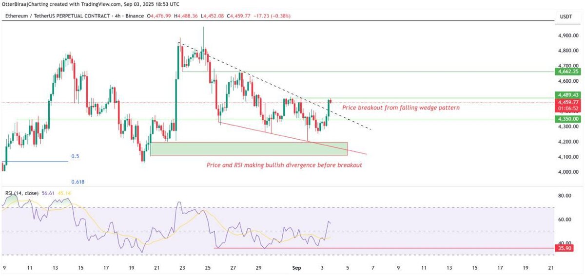 • Эфир пробил двухнедельный падающий клин, что технически открывает дорогу вверх.