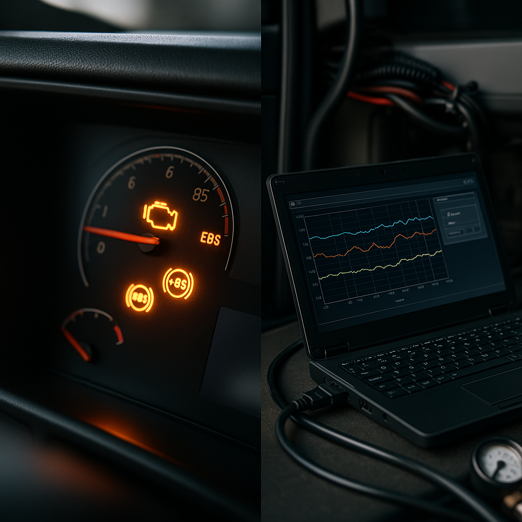 - Ошибки по тормозам и стабилизации. Антиблокировочная система (ABS) и электронная тормозная система (EBS) фиксируют события по колёсам и датчикам — игнорировать опасно.