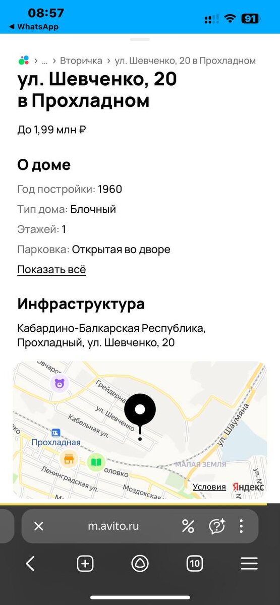 Продается трехкомнатная квартира в Кабардино-Балкарской Республике, город Прохладный, улица Шевченко, дом 20. Продажа напрямую от собственника, без посредников. Звоните Татьяне по номеру 89183883404. Общая площадь квартиры — 52,9 кв. м, кухня — 12 кв. м, жилая площадь — 37 кв. м. Квартира принадлежит одному собственнику, без ограничений и обременений. Дом блочный, построен в 1960 году. Расположена в районе старого кабельного завода. Окна пластиковые, крыша новая, из металлопрофиля. В квартире установлен новый котел. Высота потолков — 2,9 м. Санузел совмещенный. Квартира в хорошем состоянии, теплая, уютная и чистая. Осталась мебель: кухонный гарнитур, угловой шкаф, а также новая газовая колонка, вытяжка и пластиковые трубы. Вода выведена на улицу для полива. Во дворе есть фундамент для пристройки и сарай с подвалом. На участке растут фруктовые деревья: малина, смородина, клубника. Можно выращивать овощи. Есть хозпостройка с подвалом. Развитая инфраструктура: новая асфальтированная дорог