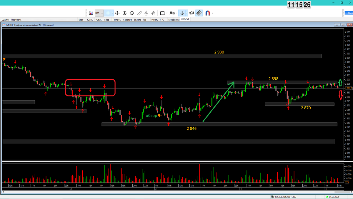 В среду, так и не обновив локальную поддержку 2 846, как это ожидалось в утреннем обзоре https://t.me/treydingnenaslovah/3471, рынок тем не менее реализовал намеченный лонговый сценарий, придя в зону продаж 2 900 После чего цена продолжила торговаться в локальном диапазоне, на границах которого прослеживается как медвежья, так и бычья активность По сути дела цена торгуется примерно в середине часового флета 2 846 - 2 930, где в целом рынок находится в балансе, то есть одинаково сильны обе силы. Это означает, что локально рынок может, как продолжить рост по направлению к верхней границе флета, как возобновить падение и вернуться к нижней границе флета, так и продолжить торговаться внутри узкого текущего диапазона на протяжении какого-то времени Другими словами, лезть в рынок на текущих уровнях — в принципе не очень благоприятно. Помните, находиться вне позиции — это тоже позиция! 👉 Предыдущий пост https://t.me/treydingnenaslovah/3423 #ИндексМосбиржи #IRUS #ММВБ