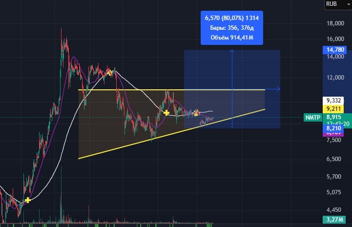 #NMTP #НМТП 📊Похоже цена строит разворот – это хороший знак для среднесрочных инвесторов. 🔼Отталкивается от уровня поддержки 8,485, первым сопротивлением выступает медленное ЕМА 9,360, если пробьет и закрепится, то скорее всего, пойдёт к уровню 11 и построит треугольник с прямой стороной. ✔️После пробития треугольника отработка идёт на повышение, я предполагаю, что пойдём до 15, 615, а там рядом и последний максимум . НЕ ИИР