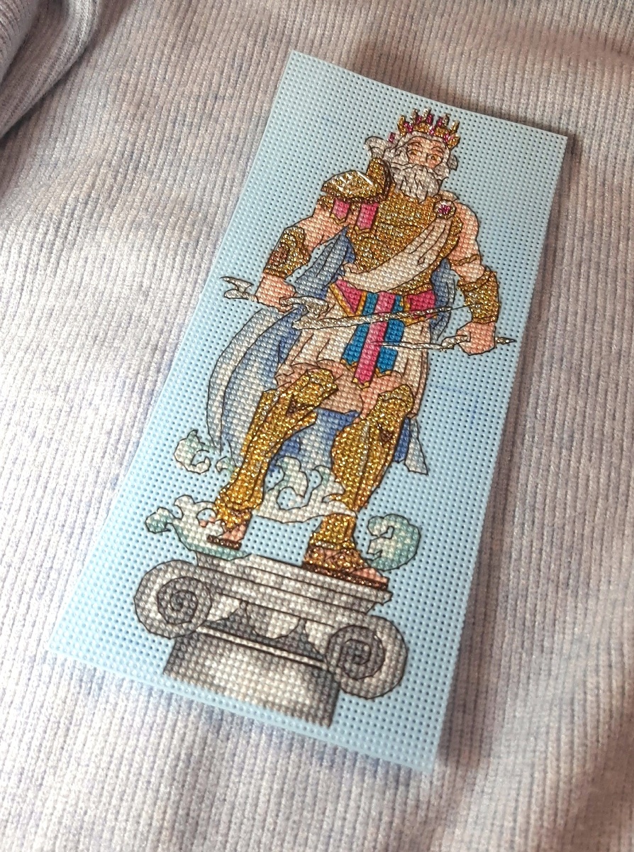 Привет, мои рукодельные товарищи, мастера и мастерицы, чьи пяльцы видели всякое! Готовы услышать сагу о битве, где вместо мечей – иглы, а вместо щитов – канва? Вышивка – это медитативный процесс, умиротворяющий и спокойный. По крайней мере, так говорят. Моя же история знакомства с богами Олимпа началась не с божественного откровения, а с эпичного квеста на выживание. Место действия: моя квартира. Главный герой: я и мой новый «босс» – схема «Зевс Громовержец». Его условия: финиш до 31 августа, и в награду – схема Посейдона даром. Спойлер: я провалила миссию. Первый бог дался не без трудностей. Началось с того, что мулине, казалось, жило своей жизнью. Оно путалось, сворачивалось в клубки посложнее лабиринта Минотавра и явно подшучивало надо мной. Я пыталась договориться, угрожать ножницами, но нитки были непреклонны. Что-то явно шло не так.. После длительные душевные терзания с металликом. Ну вы помните.. Потом на горизонте появился главный противник любого рукодельника – катастрофическ