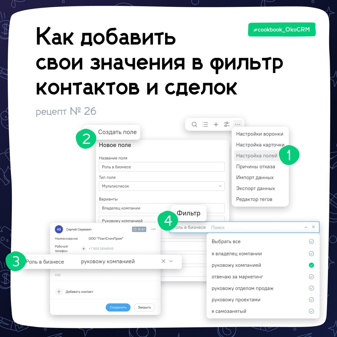 ❔Как добавлять кастомные значения в фильтр контактов и сделок Нам в саппорт написал Станислав из Сочи: Дорогая OkoCRM, я хочу массово создать новые сделки на клиентов в моей базе, которые занимают руководящие позиции — буду делать допродажи. Но такого параметра нет ни в контактах, ни в фильтрах. Как быть? Помогите🙏 Дорогой Станислав, эта задача решается с помощью кастомных полей. Когда вы добавляете такое поле в карточку, оно автоматически отображается значением и в фильтрах. Смотрите: 1️⃣ В контактах или сделках — в зависимости от того, что хотим фильтровать — заходим в три точки → Настройка полей. 2️⃣Добавляем новое поле. Если это поле «Роль в бизнесе» с несколькими вариантами, тип поля — Мультисписок. 3️⃣ Заполняем это поле в карточках контактов (или сделок). 4️⃣ Фильтруем контакты (или сделки) по кастомному полю и массово создаём сделки. Готово! Вот подробная инструкция, как создавать новые поля → #Cookbook_OkoCRM
