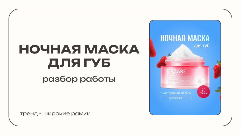 Сегодня хочу разобрать очень интересную работу. Дизайн создавался для ночной маски для губ. Сам дизайн карточки выглядит довольно нетипично, за счет пустого пространства по бокам. Именно отсутствие лишних графических элементов, текстуры на фоне, цветов в карточке даёт нам возможность зацепить внимание покупателя, ведь такое оформление есть далеко не у каждого товара. Ниже я покажу поисковую сетку, и вы сами наглядно это увидите. Светло-синий градиентный фон добавляет карточке легкости, визуальной чистоты, а сам наш товар выглядит очень вкусно, он не теряется на фоне, а сразу за считанные секунды позволяет понять, что он из себя представляет. Все наши аргументы по читабельности немного страдают, потому что здесь мы делаем акцент не на них, а на визуальной части дизайна. И скажу сразу, так всё и было запланировано, это еще один наш тренд, с помощью которого, ваша кликабельность станет высокой. В дальнейшей воронке все аргументы с главной карточки мы будем раскрывать очень подробно, чтоб