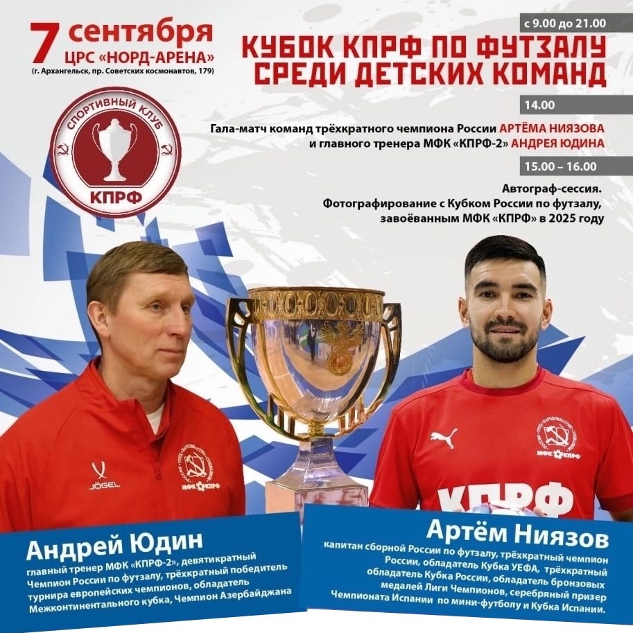 🏆 Кубок России по футзалу в Архангельске! В ближайшее воскресенье, два легендарных игрока привезут Кубок России в Архангельск. ⚽ капитан Сборной России, лидер мини-футбольного клуба "КПРФ" (г. Москва), обладатель Кубка УЕФА, трёхкратный чемпион России, трёхкратный обладатель Кубка России, обладатель бронзовых медалей Лиги Чемпионов Артём Ниязов; ⚽ главный тренер мини-футбольного клуба "КПРФ-2" (г. Москва), девятикратный чемпион России, трёхкратный победитель лиги европейских чемпионов, обладатель Межконтинентального Кубка, Чемпион Азербайджана Андрей Юдин. Праздник мини-футболу состоится 7 сентября в Центре развития спорта "Норд-Арена". Пообщаться с легендами российского мини-футбола, получить автограф и сфотографироваться с Кубком России можно после 14 часов. Также Андрей Юдин проведёт мастер-класс для 12-13-летних футболистов города Архангельска.