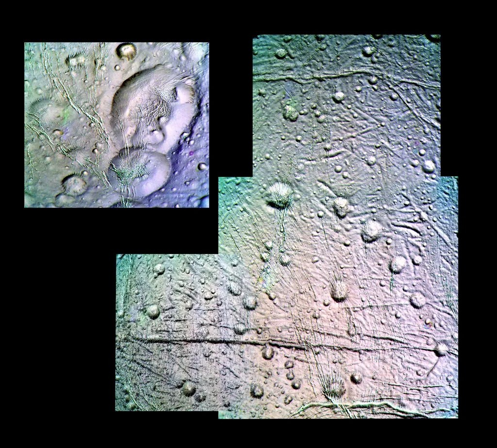 Крупные планы ледяного спутника Сатурна Энцелада. Смонтировано из двенадцати отдельных изображений, полученных в инфракрасном, зелёном и ультрафиолетовом диапазонах космическим аппаратом НАСА «Кассини».