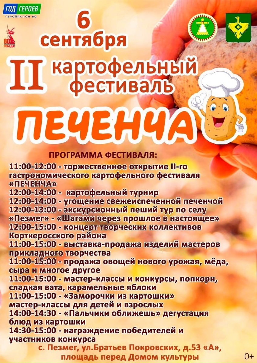 Внимание всем любителями картошки 🥔 В Пезмеге Корткеросского района пройдёт II Гастрономический картофельный фестиваль «ПЕЧЕНЧА». Что нас ждёт: — угощение свежеиспеченной выпечкой — дегустация лучших блюд из картофеля «Пальчики оближешь» и картофельный турнир — ярмарка и мастер-классы для взрослых и детей — концерт творческих коллективов Корткеросского района — пешая экскурсия по селу «Шагами через прошлое в настоящее» 📆 6 сентября, начало в 11:00 📍 площадь перед Домом культуры (ул. Братьев Покровских, 53 «А»)