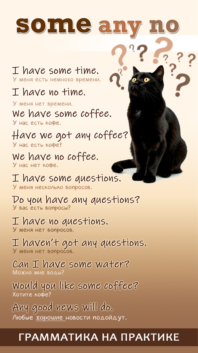 Правило №1 - в утвердительных предложениях используются some или no, в отрицательных и вопросительных - any. №2 - Можно использовать some в вопросах, если вы ждёте положительный ответ. №3 - Можно использовать any в утвердительных предложениях, если вам всё равно / без разницы / не принципиально :) ... И ещё... в английских предложениях нет двух отрицаний. Мы можем сказать: " Я Ничего Не знаю!", но по-английски это будет или I know nothing или I don't know anything. :)