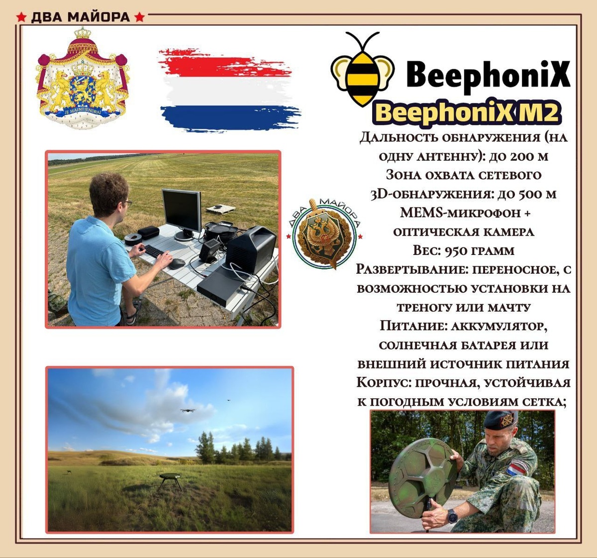 🦾 В Нидерландах разработали систему акустического опознавания дронов. Компания BeephoniX, производящая слуховые аппараты, по заказу Минобороны страны, интегрировала свои технологии в противодроновую систему BeephoniX M2, состоящую из акустических датчиков. Прибор использует 151 микроэлектромеханический микрофон на устройство и искусственный интеллект для распознавания объекта, создания его 3D-образа, определения направления и скорости полёта. BeephoniX M2 диаметром около 35 см и весом всего 950 гр, может работать от батарей, солнечной энергии или внешнего источника. Устройство позволяет детектировать дроны в радиусе до 200 метров. При этом он работает в пассивном режиме, что минимизирует риски его обнаружения по электромагнитному или радиолокационному излучению. Аналогичные системы, основанные на использовании гражданских технологий (т.е. уже готовые к использованию и которые есть в наличии) в неединичном варианте разработаны умельцами в войсках ещё в 2023 году, но до сих пор ни