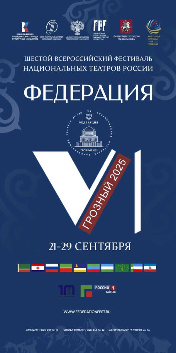 Союз театральных деятелей Российской Федерации публикует программу VI Всероссийского Фестиваля национальных театров «Федерация», который состоится 21-29 сентября в городе Грозном. 21 сентября • 16:00 — Церемония открытия VI Всероссийского Фестиваля национальных театров «Федерация» на сцене Чеченской государственной филармония им. А. Шахбулатова • 19:00 — Чеченский государственный драматический театр имени Ханпаши Нурадилова — спектакль «Гамлет» на сцене Чеченского государственного драматического театра им. Ханпаши Нурадилова 22 сентября • 15:00 — Мордовский государственный национальный драматический театр — спектакль «Побег из ада» на сцене Чеченского государственного драматического театра им. Ханпаши Нурадилова • 19:00 — Московский театр Олега Табакова — спектакль «Матросская Тишина» на сцене Государственного русского драматического театра имени М. Ю. Лермонтова 23 сентября • 15:00 — Татарский государственный театр им. Г. Камала — спектакль «Возвращение Тукая» на сцене Чеченского гос