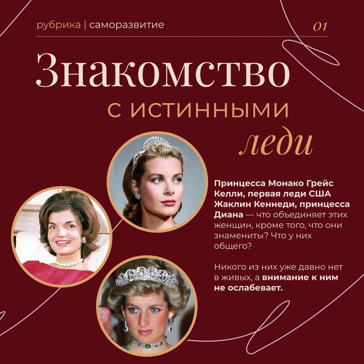 Я хочу предложить вам небольшой исторический экскурс и познакомить вас с истинными леди, за которыми прочно закрепилось звание «икона стиля». Принцесса Монако Грейс Келли, первая леди США Жаклин Кеннеди, принцесса Диана — что объединяет этих женщин, кроме того, что они знамениты? 🫅🏼 Что у них общего? Никого из них уже давно нет в живых, а внимание к ним не ослабевает. Ими восхищаются, с них берут пример, о них пишут книги и снимают фильмы. Платья из их гардероба находятся в музеях моды и периодически экспонируются. Кроме того, что две из этих женщин были первыми леди, а одна — женой наследника британского престола (Грейс Келли — жена князя Монако, Жаклин Кеннеди — супруга Президента США, а Диана — жена принца Чарльза), их как раз объединяет то, что они являются признанными иконами стиля. Почему? Сейчас попробую объяснить. Они обладали совокупностью таких качеств, как красота, благородное происхождение, высокий социальный статус и собственный вкус. Можно вырасти в прекрасной семье