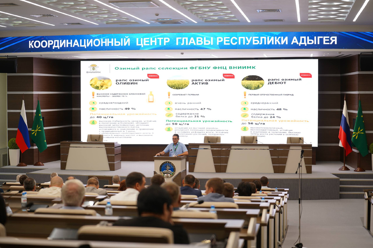 Делегация ВНИИМК во главе с заведующим агротехнологическим отделом ФГБНУ ФНЦ ВНИИМК, канд. с.-х. наук Александром Сергеевичем Бушневым приняла участие в совещании на тему: «Проведение сева озимых зерновых и зимующих культур под урожай 2026 года» в Майкопе. Мероприятие было организовано Министерством сельского хозяйства Республики Адыгея. Наш ученый выступил с докладом об особенностях возделывания рапса озимого селекции ВНИИМК. Александр Сергеевич обозначил перспективы и риски принятия решения о выращивании рапса озимого, назвал лучших предшественников для него, рассказал о методах обработки почвы и тезисно проговорил технологию возделывания рапса озимого. Также ученый дал рекомендации по внесению удобрений и поделился комплексом мероприятий по уходу за посевами рапса озимого в весенний период. Более подробно заведующий агротехнологическим отделом остановился на новинках рапса озимого. Сорт ОЛИВИН — высокое содержание олеиновой кислоты – более 79 % — среднепоздний масличность 49 % —