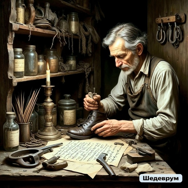 Когда-то у нас жил сапожник, часами чинил тишину. Бывало достанет подсвечник, поставит на стол, что в углу. * И банку с густым чёрным лаком, да ниток суровых моток. Всегда помогал бедолагам, для них он писал монолог. * И дыры сшивал меж словами, да паузы длинные строк. Бывало сидел он часами, стучал о сапог молоток. * И стельки, подковы и двери - всё делал для добрых сельчан. Любили его даже звери, Едой для них полон чулан. * Стихи написаны согласно созданной картиной ИИ: Сапожник, который чинит тишину. В его мастерской висят гирлянды спутанных пауз, на полках стоят банки с густым, черным лаком для дыр от выстрелов, и мотки прочной, суровой нити, чтобы сшивать разорванные ожиданием промежутки между словами. Он подбивает железными подковками стук отступающих шагов и вставляет стельки из войлока в слишком скрипучие двери. * Картинка сгенерирована нейросетью в шедеврум * © Copyright: Адилия Моккули, 2025
